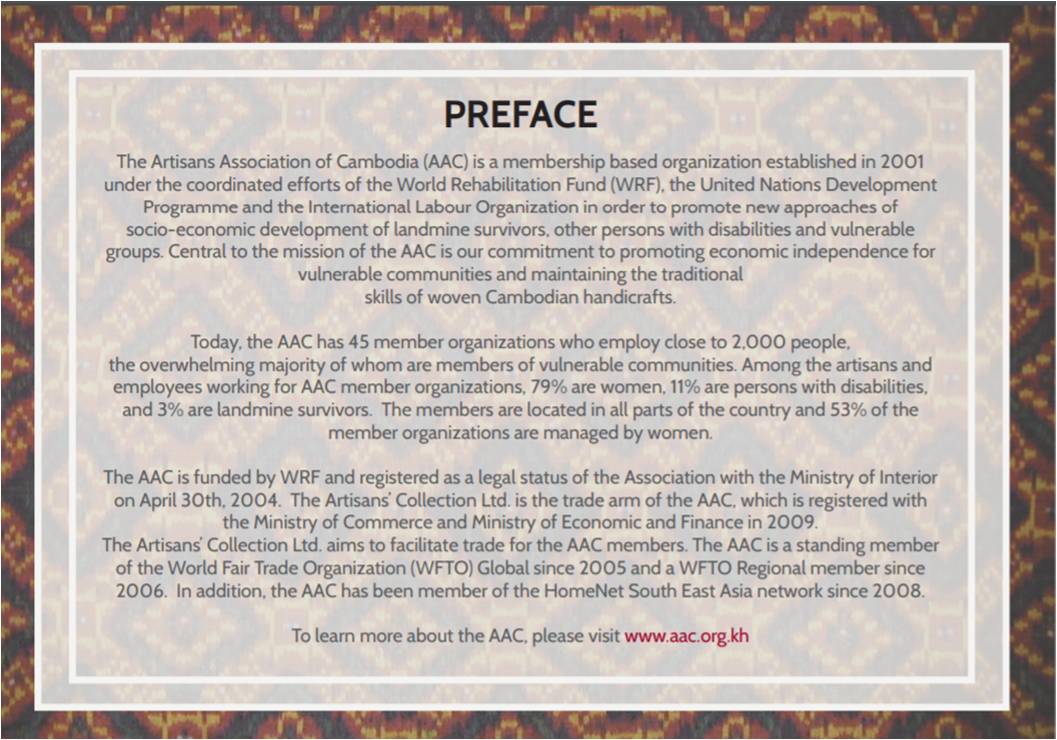 The Artisans Association of Cambodia (AAC) is a membership based organization established in 2001 under the coordinated efforts of the World Rehabilitation Fund (WRF), the United Nations Development Programme and the International Labour Organization in order to promote new approaches of socio-economic development of landmine survivors, other persons with disabilities and vulnerable groups. Central to the mission of the AAC is our commitment to promoting economic independence for vulnerable communities and maintaining the traditional